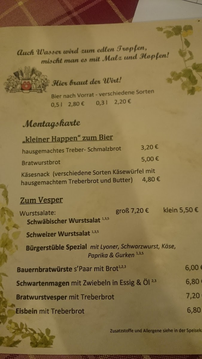 Welcome to Bürgerstüble Sigmarswangen, a hidden gem located at Anwandstraße 2, Sulz am Neckar, Germany. This charming restaurant offers a delightful menu that showcases self-brewed beers and regional delicacies, ensuring a truly authentic dining experience.